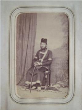 | Description / विवरण | In this photograph a person is sitting on a chair. A screen is hanging behind him. Under the chair there is an animal skin carpet. The person is well dressed in long black coat, highly decorated. He is holding a sword in his both hands. There is natural scenery behind the person. |