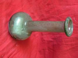 | Description / विवरण | A translucent green glass toilet bottle. It has a squat globular body. It has a tall narrow cylindrical neck. |