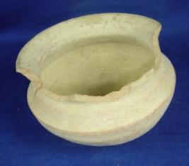 | Description / विवरण | Plain terracotta coarse vessel - Pot with flaring sides, vertical rim with concavity below, bulging body and round base. It has carination at the waist and sparse striation marks below it. The rim is almost as broad as the waist. Part of the rim is broken with a crack mark up to the middle of the body. Earthly incrustation is seen on the body. |