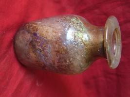 | Description / विवरण | A glass bottle in bluish green transparent colour. Rim is horizontal flange with rounded edge and narrow opening. Short neck. Shoulder with rounded edge and slight overhang, wall vertical, curing in at the bottom; base plain, slightly concave.. |
