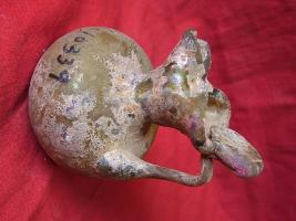 | Description / विवरण | A pitcher made up of glass transparent pale green glass. Blown . It has globular body plain round rim short tapering neck, tubular foot-ring made by folding; the base is slightly concave. Short handle, atached to shoulder and rim. |