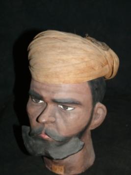 | Description / विवरण | Head gear or turban tied on the head made of papermache , of a Kayasth , caste of Rajasthan . It is in yellow colour with gota work, cotton cloth. |