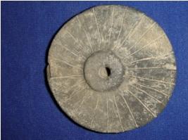 | Description / विवरण | Terracotta wheel of a toy cart, black in colour. There is a hole at the center of the wheel to attach it with the axle of the cart. Out side of it incised line designs are seen. The surface near the hole is raised outwards. |