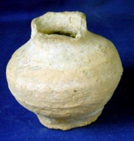 | Description / विवरण | Terracotta jar, crudely finished, thick fabric, broken averted rim and neck, carinated circular body and flat circular and footed base. |