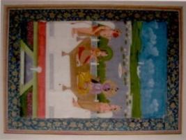 | Description / विवरण | The painting depicts Rama and Sita seated on a golden bed looking at each other with Hanuman standing behind Sita and an attendant behind Rama. The foreground has a pond with fountain and flowers at either side a white platform in the middle ground, a gray watered pond, a narrow strip of field and blue sky at the background. |