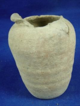| Description / विवरण | Terracotta jar having circular flat base, cylindrical body with corrugated profile and flared averted rim. Small portion of rim is there, rest is broken. Sparse striation marks are in the interior surface. There is a crack on the upper portion of the body. Clay incrustation all over. |