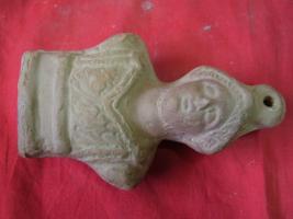 | Description / विवरण | A portrait bust of the goddess Athena. She is wearing a helmet.The back in slightly convex with a square opening to introduce a lamp. |