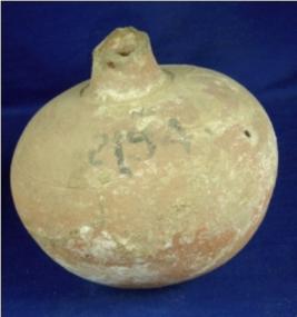 | Description / विवरण | Semi fine, terracotta jar with a broken neck, which is partly visible carinated marks is seen just below the neck, bulbous body and oval shaped base. Most of probably, it was a pot like surahi whose neck is broken. Earthly incrustation all over. |