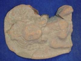 | Description / विवरण | Terracotta female figurine, probably a Yakshi, depicting on low relief. Only the upper part of the body from chest is visible. The right arm is visible while the left hand is missing. The figure has an elaborate headgear having a floral design in the centre and bedecked with earrings of circular shape and necklace. |