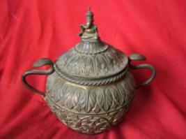 | Description / विवरण | This is a vase Ganesh katora with two handles. The image of Ganesha is mounted on the top of the lid and engraved with repousse ornament. |
