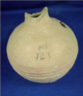 | Description / विवरण | Semi fine, terracotta Tiny pot with narrow broken neck, round body and flat circular base, striation marks are prominent on the body. Most probably it had a long neck like surahi which is broken. |