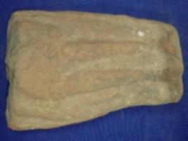 | Description / विवरण | Terracotta female figurine, probably a Mother Goddess in standing position in low relief. Her upper part of the body from waist is missing but hands are partly visible, with the right hand holding fishes and left hand is resting on thigh. The figure is bedecked with girdle and anklets. |