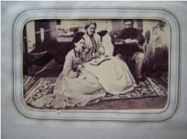 | Description / विवरण | This is a group photograph of three people out of which there are two women, sitting on the mat. One beared person is sitting on a chair beside them. |