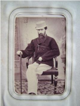 | Description / विवरण | In this photograph a beared man is sitting on the chair with black coat, white trousers and a white English hat . A chain is fixed on the coat, going inside its pocket. He is holding a wooden stick in his right hand. |