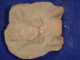 | Description / विवरण | Terracotta female figurine in a low relief. The upper part of the body from chest is visible and arms are seen. The figure has an elaborate head gear, having a floral design in the centre. She is bedecked with earrings and necklace. The facial features are not prominent while the breasts are clearly visible. |