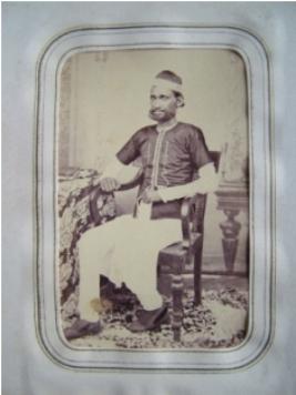 | Description / विवरण | In this photograph, man is sitting on the chair. Beside him, a table with a tablecloth of floral design is kept. He is well dressed in coat highly decorated, white kurta, pyjama and black shoes. He is also wearing a cap with a white border. |