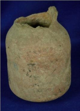 | Description / विवरण | Terracotta jar of cylindrical body, circular base and broken neck. It is ill fired, visible through its cross section. |