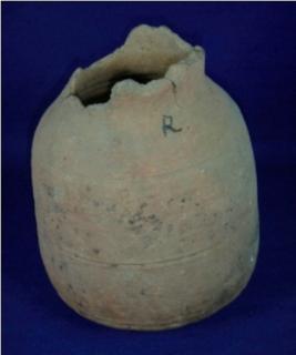 | Description / विवरण | Terracotta vessel - jar, slightly oval base, cylindrical body with sparse striation marks, low neck and narrow mouth. The rim is thick and featureless. |