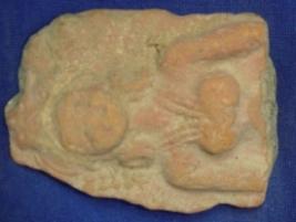 | Description / विवरण | Upper part of a terracotta female figurine probably of a yakshi in low relief. The body below waist is missing. Her face is slightly tilted upward. She is having an elaborate hairstyle with pearl strings at the left side. She is bedecked with necklace and round ear rings. |