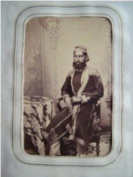 | Description / विवरण | In this photograph one person sitting on the chair. Beside him, a table with a tablecloth of floral design is kept. The person is well dress in kurta which is zari work and pyjama which is printed checks. The cap, which is on his head, is highly decorated. |