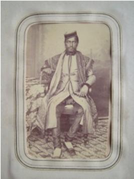 | Description / विवरण | In this photograph, one person is sitting on a chair. Besides him, a table with a table cover of floral design is kept. The person is well dressed in long kurta, which is highly decorated, black pyjama, white socks, black shoes and shawl intricately embroidered. The cap has a broad border. He is holding an unidentified object and left hand is on chair-arm |