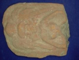 | Description / विवरण | Terracotta female figurine, only the body above stomach is visible. It is depicted on low relief. She is having an elaborate hair style, decorated with leaf shaped hair design, bedecked with large round earrings, necklace and a Yajnopavit. The whole fragment is almost mutilated so features are not clear. |