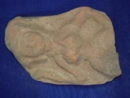 | Description / विवरण | Terracotta female figurine, in low relief, her lower portion is missing from hips. She is holding something with right hand and left hand is on thigh. She is bedecked with round earrings and necklace and the drapery is partly visible. |