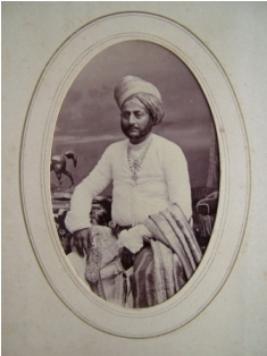 | Description / विवरण | shows maharaja in sitting posture, wearing a white tunic, bright colour turban, necklace, holding a sword in one hand and bright colour shawl in other hands. In the background, part of table and chair is visible. |