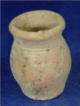 | Description / विवरण | Plain terracotta vessel-tiny jar, with broad mouth, round body and broad, flat base. The bottom of the neck has close striation marks. |