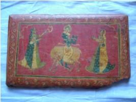 | Description / विवरण | It is a wood painting depicts Lord Krishna standing near the cow, playing the flute, wearing yellow colour dhoti and mukat . On either side cow herdesses, gopi are standing, one of them is swinging fan. The painting is done on the red colour background having a border made in a floral manner with yellow, red, green colour on the backside, There is painting made in a floral manner having border also made in a floral manner. The colour used is yellow, green. |