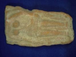 | Description / विवरण | Terracotta female figurine, probably a yakshi, in standing position in relief. The upper portion above the shoulder is missing. She is holding probably two fishes in the right hand and left hand placed on the girdle. A necklace girdle and anklets are visible. It is rubbed out and the feet are broken. |
