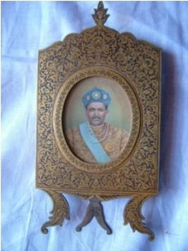 | Description / विवरण | The painting depicts maharaj ji s bust, wearing decorated floral jama blue colour dupatta, the necklace made up of beads and taj. The painting is in the metal frame. |