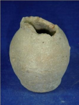 | Description / विवरण | Plain terracotta vessel - small jar, with a round body and broad, flat base. The mouth and neck are broken. It is a coarse pottery. |