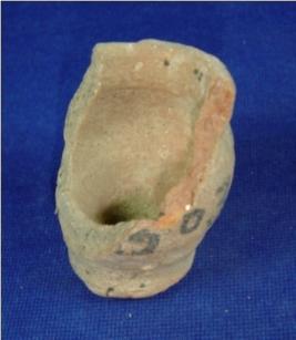 | Description / विवरण | Plain terracotta vessel, probably miniature jar, with broad mouth, slightly bulbous body and broad, flat and circular base. The base has a perforated hole in the centre. Half portion is broken at one side. It is a coarse pottery, with black core which signifies that it is ill fired. |