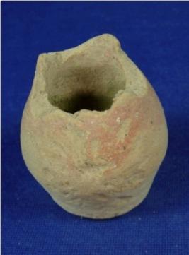 | Description / विवरण | Plain terracotta vessel, probably miniature jar, with bulbous body and broad, flat and circular base. The mouth and neck are broken. It is a coarse pottery. |