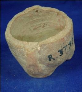 | Description / विवरण | Terracotta jar of cylindrical shape on three legs. On the sides are human hands. The wheel marks in the inner side are prominent. One leg is broken and other two are half broken. The upper part is missing. |
