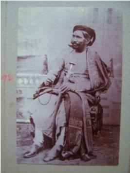 | Description / विवरण | The photograph shows Thakur Bhopal Singh Rao sitting on a chair wearing white Jama , and payjama with the shawl on his shoulder, turban and holding the rosary in one hand and sword in another. Building and fence are visible in the background |