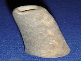| Description / विवरण | Terracotta Games men betel nut shape, broken top creating a hole in centre and flat, circular base. |