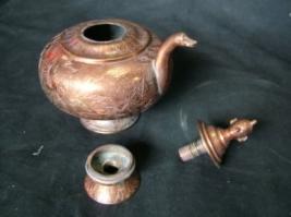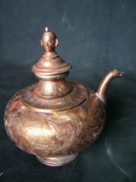 | Description / विवरण | It is water vessel with spout. A figure of a human head is mounted on the top of the lid. It is engraved with floral leaf pattern. Spout has engraved animal face. |