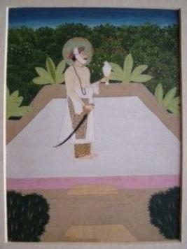 | Description / विवरण | The painting shows a sardar in sitting posture wearing white colour jama, dark colour turban. The painting is in the metal frame, arch-shaped. |