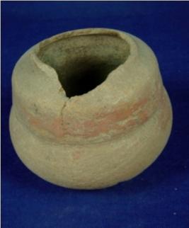 | Description / विवरण | Coarse terracotta vessel - jar having shape of double lota. The diameter of lower body is more than the upper one. The base is flat and circular mouth above body is broken. |