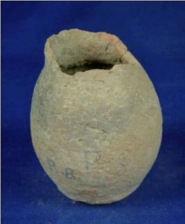 | Description / विवरण | Coarse terracotta Miniature jar having flat and circular base cylindrical body, low neck and narrow mouth. The rim is thick and averted but almost broken. |