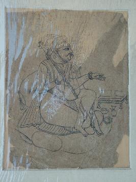 | Description / विवरण | A Badak Santh is shown in line drawing in this painting. He is in sitting posture and holding a Tanpura like instrument in his hand. He is wearing a turban and dhoti. A pillow is shown behind him. |