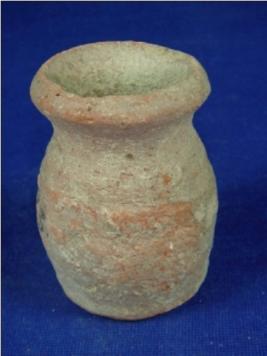 | Description / विवरण | Coarse terracotta Miniature Pot in cylindrical shape, high narrow neck, thick and averted rim and a flat circular base, some striation marks are seen on the body. |