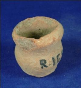 | Description / विवरण | Coarse terracotta Miniature jar with broad high neck, inverted rim, bulbous shaped body and a flat circular base. The diameter of base is smaller than diameter of mouth. |