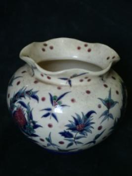 | Description / विवरण | Bowl, wide mouthed with scalloped top, cream coloured porocelain with flowers in green & gold. |