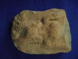 | Description / विवरण | Terracotta female figurine. The upper part of the body from chest is visible on low relief and hands are seen up to elbows. The figurine has an elaborate head gear, mutilated face. The figure is adorned jewels like kundala. |