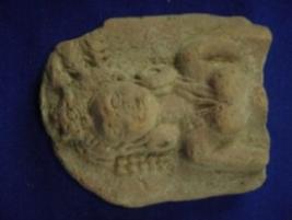 | Description / विवरण | Terracotta female figurine on high relief depicting only the upper part from chest . The figurine has an elaborate head gear and adorned with jewels like kundala and necklace. The hands are visible up to the elbows. |