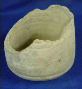 | Description / विवरण | Coarse terracotta ill fired jar where the upper part is missing. The remaining body part is cylindrical in shape with oval base, some incised in lines are seen on the body there is a hole in the base. |