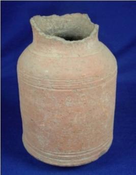 | Description / विवरण | Semi fine, red slipped terracotta jar with circular base, cylindrical body, narrow and slightly long neck. Its rim is missing. The body has close striation marks on upper and lower part of the body. |